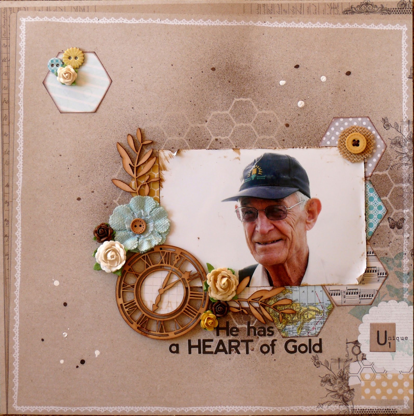 My take on the sketch using the gorgeous My Minds Eye 'Follow Your Heart' collection. The pic is of my dad when the were visiting a short while ago. He sure has a heart of gold. xx